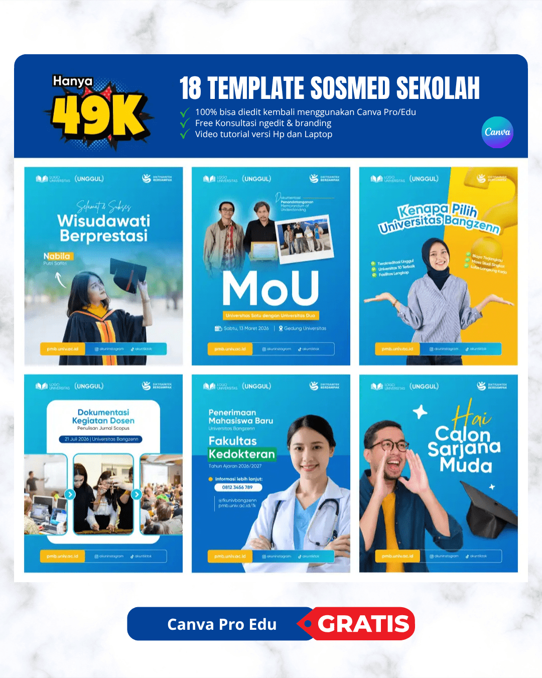 Template ini dirancang khusus untuk kebutuhan promosi, informasi akademik, pengumuman kegiatan, ucapan hari besar, penerimaan siswa/mahasiswa baru, hingga branding institusi pendidikan agar feed Instagram terlihat rapi, estetik, dan terpercaya.